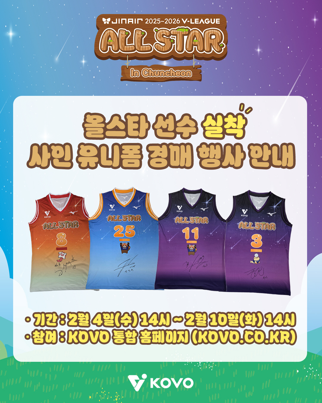 한국배구연맹은 4일 "지난 1월 25일(일) 춘천 호반체육관에서 성료한 진에어 2025~2026 V-리그 올스타전에 참가한 올스타 선수들의 실착&친필 사인 유니폼 총 38벌(올스타 미출전 선수 허수봉, 알리 제외)을 4일(수) 오후 2시부터 10일(화)까지 6일간 경매를 진행한다"고 밝혔다.