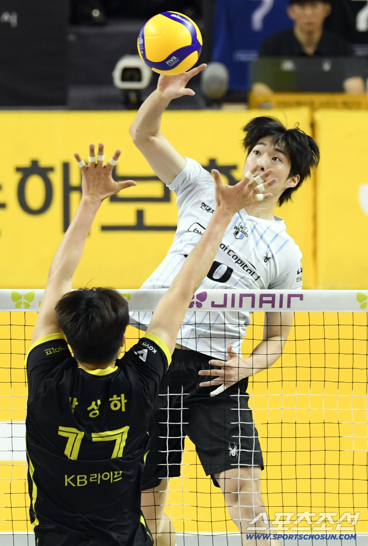 5일 의정부 경민대학교 체육관에서 열린 V리그 남자부 KB손해보험과 현대캐피탈의 경기. 현대캐피탈 김진영이 상대 블로킹을 피해 공격을 시도하고 있다. 의정부=박재만 기자 pjm@sportschosun.com