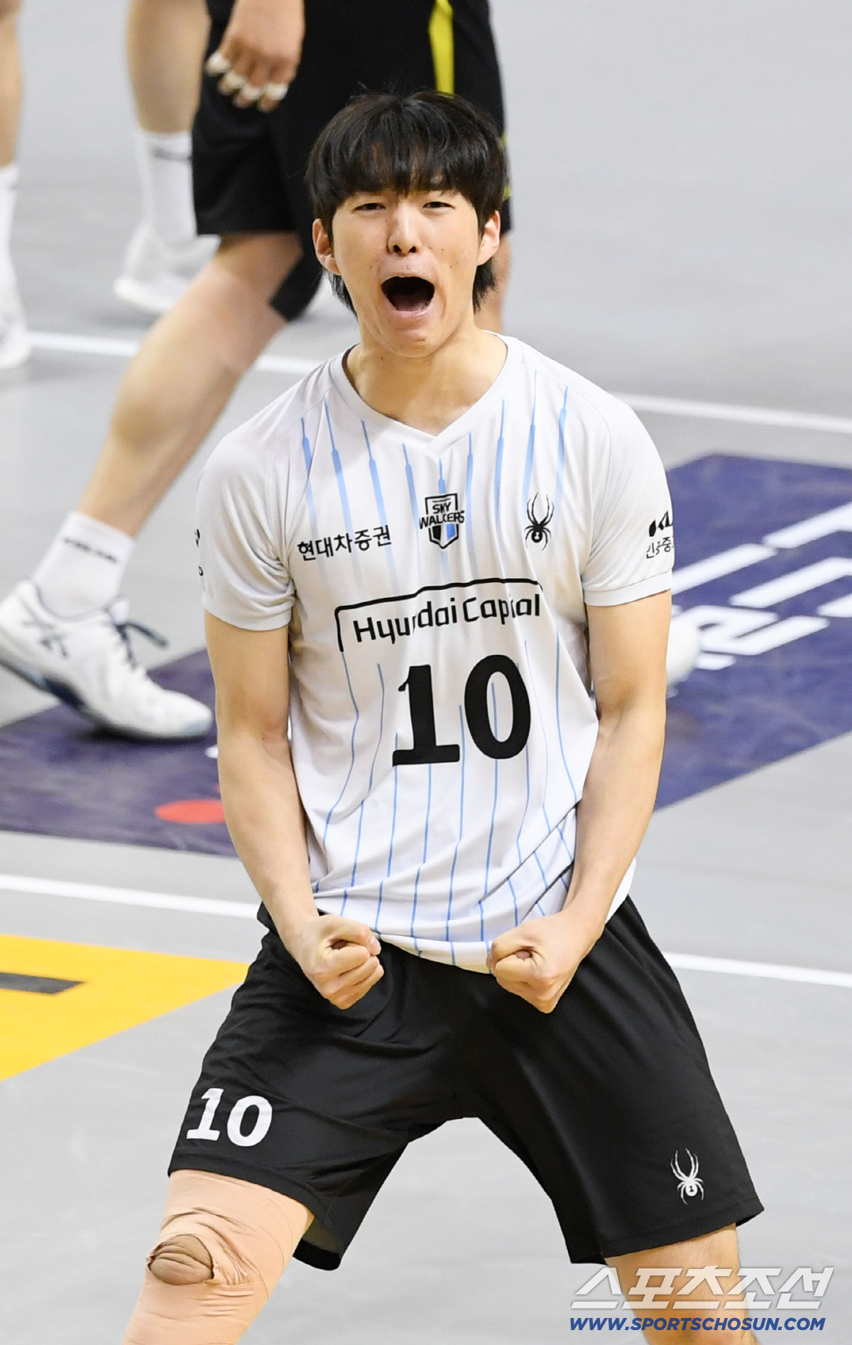5일 의정부 경민대학교 체육관에서 열린 V리그 남자부 KB손해보험과 현대캐피탈의 경기. 현대캐피탈 김진영이 득점 후 환호하고 있다. 의정부=박재만 기자 pjm@sportschosun.com