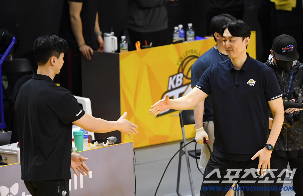25일 의정부 경민대학교체육관에서 열린 V리그 남자부 준PO KB손해보험과 우리카드의 경기. 우리카드 박철우, KB손해보험 하현용 감독대행이 인사를 나누고 있다. 의정부=박재만 기자 pjm@sportschosun.com