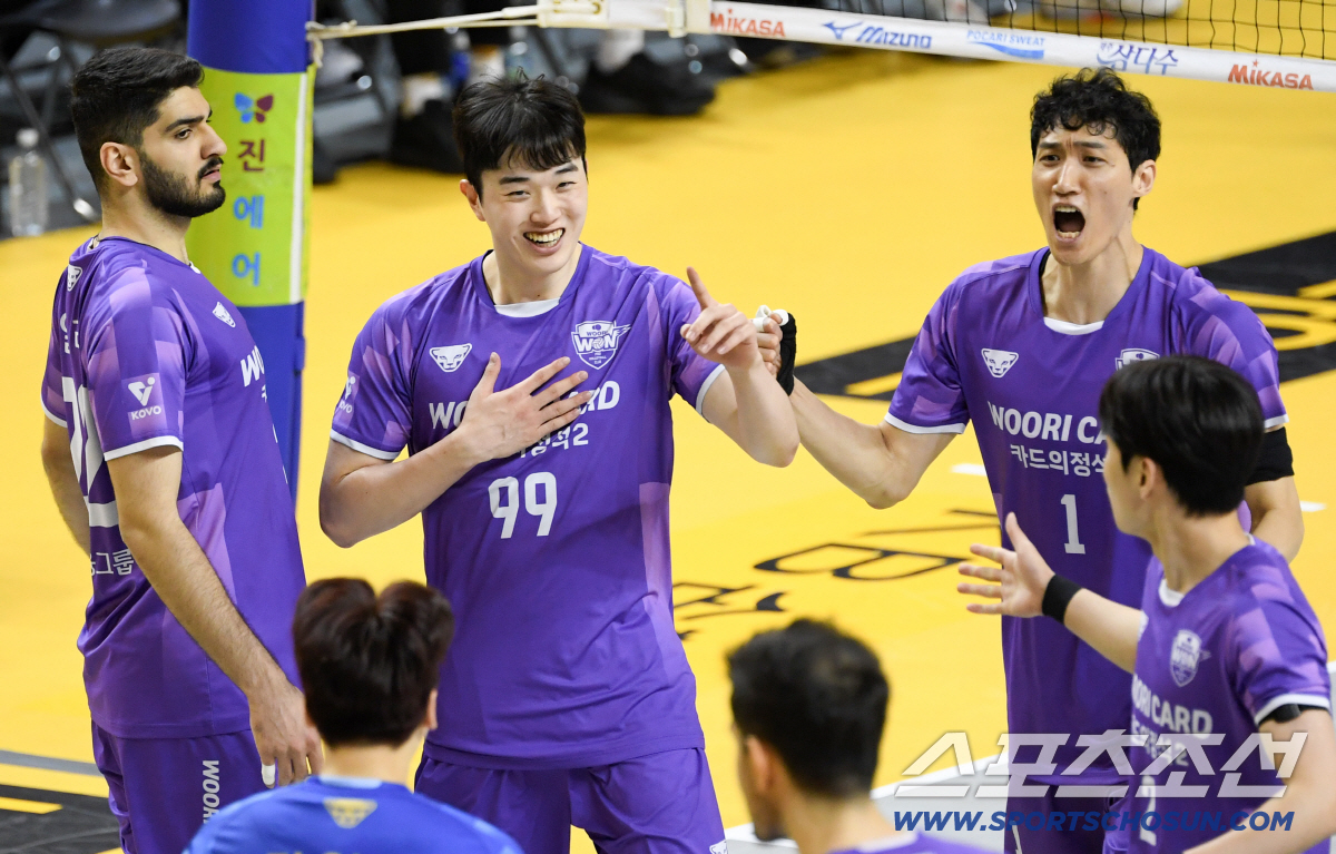 25일 의정부 경민대학교체육관에서 열린 V리그 남자부 준PO KB손해보험과 우리카드의 경기. 우리카드 김지한이 득점 후 환호하고 있다. 의정부=박재만 기자 pjm@sportschosun.com