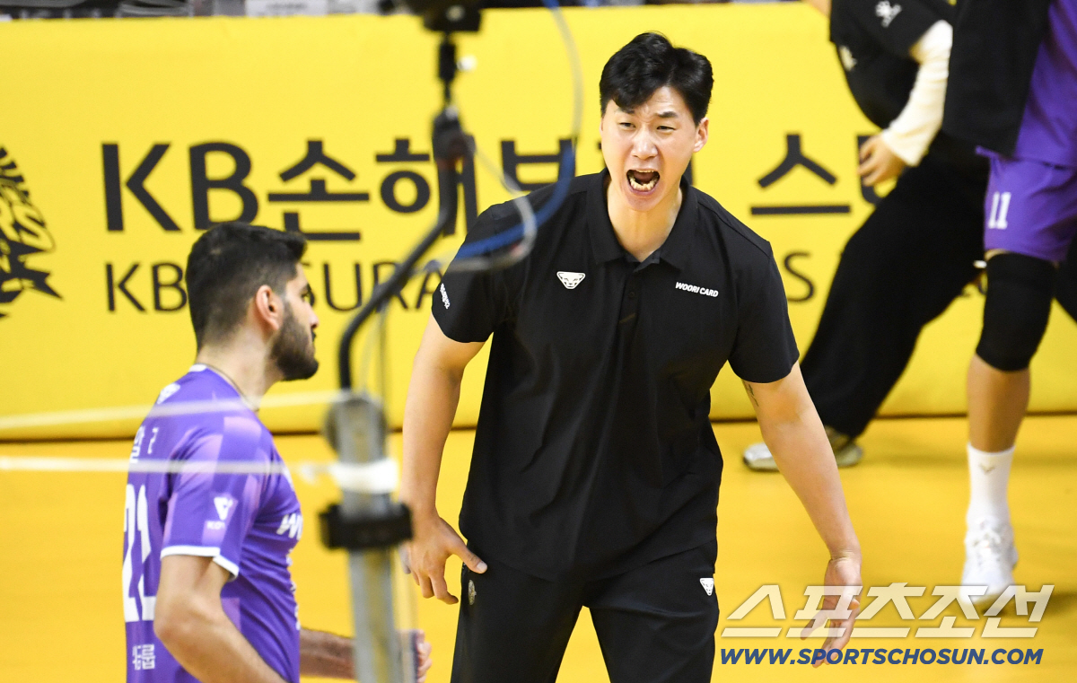 25일 의정부 경민대학교체육관에서 열린 V리그 남자부 준PO KB손해보험과 우리카드의 경기. 우리카드 박철우 감독대행이 환호하고 있다. 의정부=박재만 기자 pjm@sportschosun.com