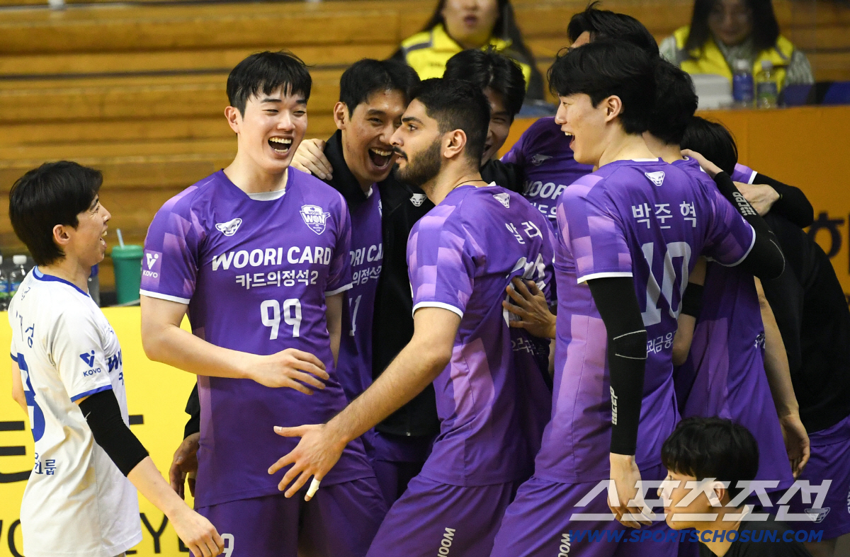 25일 의정부 경민대학교체육관에서 열린 V리그 남자부 준PO KB손해보험과 우리카드의 경기. 우리카드 김지한, 알리가 득점 후 환호하고 있다. 의정부=박재만 기자 pjm@sportschosun.com