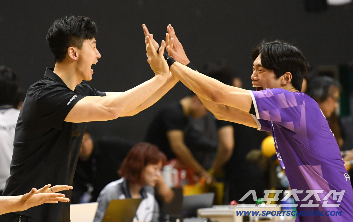 25일 의정부 경민대학교체육관에서 열린 V리그 남자부 준PO KB손해보험과 우리카드의 경기. 승리한 우리카드 선수들이 기뻐하고 있다. 의정부=박재만 기자 pjm@sportschosun.com