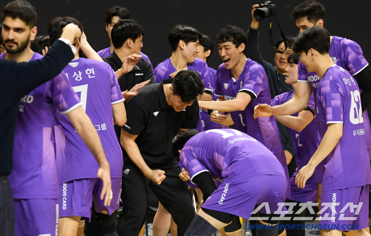 25일 의정부 경민대학교체육관에서 열린 V리그 남자부 준PO KB손해보험과 우리카드의 경기. 승리한 우리카드 선수들과 박철우 감독이 기뻐하고 있다. 의정부=박재만 기자 pjm@sportschosun.com